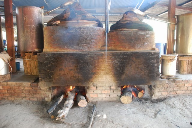 We managed to drive in through most of it, it turned out, to a river too wide for the truck, and we parked and I took all the things I didn’t want to leave parked in an unknown remote space and we piled it all into a small canoe and poled our way across the river. Reaching the other side, we gathered our things and marched off--I was very slow as my overnight bag was heavy and banging my legs, and I also had my camera, purse, a litre of water and 2 big bags of fruit! But I did manage to walk to the distillery, longing for a cold shower and air conditioned room, but made do with the smoke from the boilers and a tree stump in the shade. As everywhere in Laos, plenty of nice pups soothed and smoothed the scene.